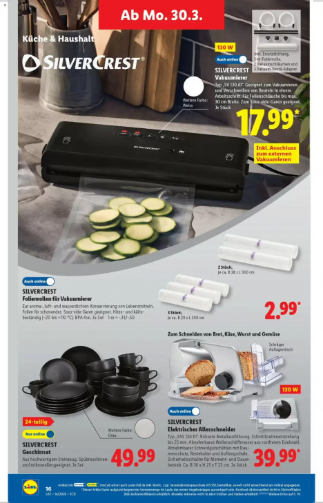 Bitte beachten Sie, dass dieser Text automatisch generiert wird und möglicherweise Fehler enthält\ u } „no Haushal 8 R Inkl. Ersatzdichtung, 3-m-Folienrolle, Auch online ® 2 Vakuumschläuchen und MVT AT 8 SILVERCREST Vakuum -Ventil-Adapter h Vakuumierer Typ „SV 130 Al“. Geeignet zum Vakuumieren „q und Verschweißen von Beuteln in einem ‚Arbeitsschritt. Für Folienschläuche bis max. Weitere Farbe: 9 30 cm Breite. Zum Sous-vide-Garen geeignet. LOS PE LH 2 =. 72 LL > hennen Sy r I "à ed m _æ 2 Stück; je ca. B 28 x L 300 cm SILVERCREST Folienrollen für Vakuumierer ze Zur aroma-, luft- und wasserdichten Konservierung von Lebensmitteln. Folien für schonendes Sous-vide-Garen geeignet. Hitze- und kälte- 3 Stück; beständig (-20 bis +110 °C). BPA-frei.Je Set 1m =-33/-50 je ca. B 20 x L 300 cm Zum Schneiden von Brot, Käse, Wurst und Gemüse ie = Ik Schräger = Auflagentisch t A ZY Kr FE me En Ex. JK SILVERCREST = = À Weitere Farbe: Elektrischer Allesschneider Nur online ® Grau Typ „SAS 120 ET“. Robuste Metallausführung. Schnittbreiteneinstellung SILVERCREST bis 23 mm. Abnehmbares Wellenschliffmesser aus rostfreiem Edelstahl. Abnehmbarer Schneidgutschlitten mit Dau- Geschirrset menschutz, Restehalter und Auffangschale. Aus hochwertigem Steinzeug. Spülmaschinen- Sicherheitsschalter für Moment- und Dauer- und mikrowellengeeignet. Je Set betrieb. Ca. B 36 x H 25 x T 23 cm. Je Stück CAEN © ind ab sofort auch unterlidl.de inkl. MwSt., Lv andkostenpauschale (€5,95), bestellbar, soweit nicht abweichend am Artikel angegeben. “Dieser Artikel kann aufgrund begre ed TLE Nonfood-Aktionsartikel nicht in Klei ilialen LHZ -14/: D tr de/kleinstfilialen) erhaltlich. Modelle teilweise nicht in allen Größen und Farben erhäl lich, (A 2 D