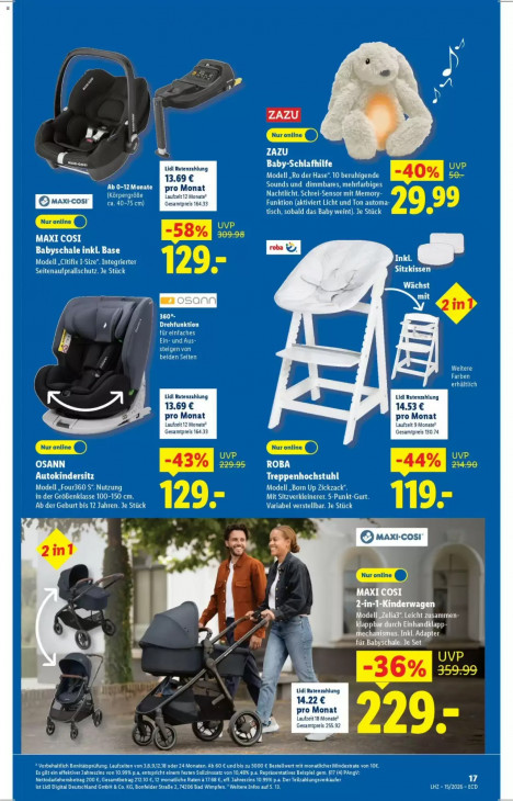 Bitte beachten Sie, dass dieser Text automatisch generiert wird und möglicherweise Fehler enthältke |E A: ZAZU Ip j x : Lon ZAZU Lidl Ratenzahlung Baby-Schlafhilfe UVP Modell „Ro der Hase“. 10 beruhigende 13.69 € m 0-12 Monate pro Monat Sounds und dimmbares, mehrfarbiges RTL Laufzeit 12 Monate? Nachtlicht. Schrei-Sensor mit Memory- ca. 40-75 cm) Gesamtpreis 16433 Funktion (aktiviert Licht und Ton automa- 99 tisch, sobald das Baby weint). Je Stück CEO UVP 58% 309-98 MAXI COSI Babyschale inkl. Base rte Modell „Citifix I-Size“. Integrierter mm 129 Q Sitzkissen Seitenaufprallschutz. Je Stück Wächst Al cn" Ber 360°- Drehfunktion für einfaches Ein- und Aus- ë steigen von beiden Seiten Weitere Farben erhältlich Lidl Ratenzahlung Lidl Ratenzahlung 13.69 € 14.53€ pro Monat pro Monat Laufzeit 12 Monate? Laufzeit 9 Monate® Gesamtpreis 16433 Gesamtpreis 130.74 CE : Ma LL 229-95 ROBA 44 -43% Autokindersitz Treppenhochstuhl Modell „Four360 S“. Nutzung n Modell „Born Up Zickzack“. in der Größenklasse 100-150 cm. Mit Sitzverkleinerer. 5-Punkt-Gurt. Ab der Geburt bis 12 Jahren. Je Stück 129. Variabel verstellbar. Je Stück LE, 5 5 5 Omaxı.cosı ck ms Nur ontine @) MAXI COSI 2-in-1-Kinderwagen Bh Æ ModellyZelia3“ Leicht zusammen- en klappbardurch Einhandklapp- mechanismus. Inkl. Adapter 4 für Babyschale. Je Set > UVP / L 359.99 N Lidl Ratenzahlung 14.22 € “ pro Monat Laufzeit 18 Monate? Gesamtpreis 255.92 % SI, = ® Vorbehaltlich Bonitätsprüfung. Laufzeiten von 3,6,9,12,18 oder 24 Monaten. Ab 60 € und bis zu 5000 € Bestellwert mit monatlicher Mindestrate von 10€. Es gilt ein effektiver Jahreszins von 10.99% p.a, entspricht einem festen Sollzinssatz von 10,48% p.a. Repräsentatives Beispiel gem. 517 (4) PAngV: Nettodartehensbetrag 200 €, Gesamtbetrag 212.10 €, 12 monatliche Raten & 17.68 €, eff. Jahreszins 10.99% p.a Der Teilzahlungsverkäufer LA ist Lidl Digital Deutschland GmbH & Co. KG, Bonfelder Strafe 2, 74206 Bad Wimpfen. "Weitere Infos auf S. 13. LHZ - 15/2026 - ECD
