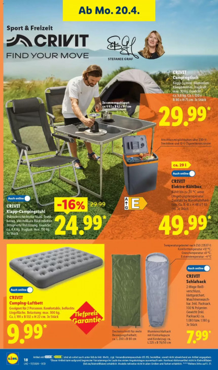 Bitte beachten Sie, dass dieser Text automatisch generiert wird und möglicherweise Fehler enthältA 20 Sport & Fr eit IN CRIVIT 5 (77 FIND YOUR MOVE zl STEFANIE GRAF Ca L Klapp-System#Alumintum- Komponenten. Tragkraft: A max. 30'kg. Gewicht: ca.5,8 kg. Ca. L120 x “ | B 80 x H71cm. Je Stück À PN a | ga.L82 62xH7em # Fe FE I =; =. | Leen » | it: | Pe 2 A 5 Rs GT) ed CRIVIT FLE Klapp-Campingstuhl Pulverbeschichteter Stahl. Textil- bezug, Verstellbare Rückenlehne Integrierte Polsterung. Gewicht: ca. 4,4 kg. Traglast: max. 110 kg. Je Stück EN ES EN ee 2 hl: CEE