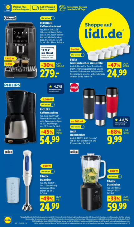 Bitte beachten Sie, dass dieser Text automatisch generiert wird und möglicherweise Fehler enthältKostenlose Retoure E ) innerhalb 30 Tage DELONGHI Kaffeevollautomat Shoppe auf LR PTE M m Höhenverstellbarer Kaffee- a auslauf. Inkl. Touch-Bedien- | feld und Milchaufschäum- lidl.de düse. Wassertank: ca. 1,81. | U | Ca. 44 x 24 x 35 cm. Je Stück 1 e= II 1} Œ BRITA N Ersatzkartuschen Wasserfilter PT Modell „Maxtra Pro Pure“. Passt in alle . BRITA Systeme (ausgenommen Classic Systeme). Reduziert den Kalkgehalt des = Wassers sowie geruchs- und geschmacks- | 79. störende Stoffe. Je Ger-Set 24.99 4.7/5 4 . | } 4 " CEO PHILIPS Kaffeemaschine Typ „Gaia HD7544/20°. Thermo-Kanne aus Edel- stahl. Fassungsvermögen: x 4.8/5 z ca. 1,2 1. Brühmenge: EED | | max. 12 Tassen. Je Stück ) ’ EMSA L 31-99 | 1.45% ÈS Isolierbecher A Modell „TRAVEL MUG Essential‘. Hält bis zu 4 Stunden heiß und 54.99 8 Stunden kalt. Je Stück î - CEETD BRAUN Œ ©) Stabmixer Typ „MQ 3001.M. BRAUN Standmixer Inkl. 2 Geschwindig- keitsstufen. Mess- Typ „IB31SOBK“, becher: ca. 0,6 L. Glasgefäß 1,5 1. Je Stück Je Stück UVP 33% Ki 24.99 9,9 “Genereller Hinweis: All Artikel solange der Vorrat richt All Preise ohne Deko, inkl.MwSt. und zzgl Versandkostenpauschale (5.95 €), soweit nicht abweichend am Artikel angegeben. Alle Artikel online auf lidl.de bestellbar. Die Angebote richten sich ausschließlich an Endkunden mit einer Lieferanschrift in Deutschland, Onlineshop-Angebote: Lidl Digital Deutschland GmbH & Co.KG, Bonfelder Straße 2, 74206 Bad Wimpfen, Telefon 030 2200 5500 (Montag- Samstag von 8:00 bis 20:00 Uhr]. Angebot ausschließlich für Nutzer der Lidl Plus App. Es gelten die Couponbedingungen in der DHZ — 17/2026 — DE Lidl Pus App. Mehr Infos unter idlplus de. Lidl Plus Preis gültig nurim Aktionszetraum und nicht auf die Versandkosten anrechenbar. "Weitere Infos zu Kundenbewertungen auf 5.21.
