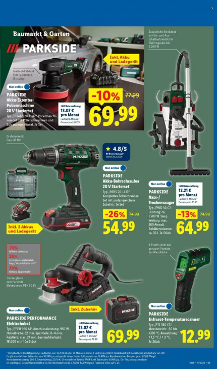 Bitte beachten Sie, dass dieser Text automatisch generiert wird und möglicherweise Fehler enthältZusätzliche Steckdose mit Ein- und Aus- Baumarkt & Garten schaltautomatik für Elektrogeräte bis 2.200W 11,8 SIL mon ER 1 A! Leerlaufdrehzahl: 500-3.000 min! En il (6-stufig) EON \ Nur a OK IDE enter- ko [411173 Lidl Ratenzahlung rset 13.07 € > Pre 0-biA2#Poliermaschi- pro Monat Laufzeit 6 Monate’ lierschwämmen und Sci lüssel. Je Set Gesamtpreis 78.39 FE \ Drehmoment: max. 45 Nm L 4 % 4.8/5 fo b =| 89 Bewertungen” ARK ten: Stand 26.2.2026 4 es m , mm NS à rn cn M PARKSIDE Akku-Bohrschrauber [ If | 20 V Starterset Lidl Ratenzahlung 12.21 € Typ „PABS 20-Li 19", PARKSIDE Komplettes Bohrschrauber- Nass-/ pro Monat Set mit umfangreichem Laufzeit 6 Monate’ Zubehör. Je Set Trockensauger Gesamtpreis 3 EL 27 Typ „PWD 30 CT“ Leistung: ca. LA 1.500 W. Saug- leistung: max. 260 Airwatt. nn = LE) Behältervolumen: 99 54 KEEL 8-Punkt-Laser zur genauen Anzeige waer der Messfläche AN trag / Arbeitsfortschritt N 5 hôhere Spanntiefe! JN f BUNTE FERN ETE Elektrohobel PEH 30 ES > IL um \- | | CEERD _pARKSIDE PARKSIDE PARKSIDE PERFORMANCE Infrarot-Temperaturscanner Elektrohobel Lidl Ratenzahlung 13.07 € Typ „PTI 380 C3°. Typ „PPEH 950 Al“. Anschlussleistung: 950 W. Messbereich: -50 bis Hobelbreite: 82 mm. Spantiefe: 0-4 mm. pro Monat +380 °C. Abweichung: Falztiefe: max. 24 mm. Leerlaufdrehzahl: Laufzeit 6 Monate’ CINE EE Gesamtpreis 78.39 16.000 min”. Je Stück 69,99 ETS 12.99 * Vorbehaltlich Bonitätsprüfung. Laufzeiten von 3,6.9.12.18 oder 24 Monaten. Ab 60 € und bis zu 5000 € Bestellwert mit monatlicher Mindestrate von 10€. Es gilt ein effektiver Jahreszins von 10.99% pa, entspricht einem festen Sollzinssatz von 10,48% p.a. Repräsentatives Beispiel gem. 517 (4) PAngV: Nettodarlehensbetrag 200 €, Gesamtbetrag 212.10 €, 12 monatliche Raten & 17.68 €, eff. Jahreszins 10.99% pa. DerTeilzahlungsverkäufer ist Lidl Digital Deutschland GmbH & Co. KG, Bonfelder Straße 2, 74206 Bad Wimpfen. "Weitere Infos auf S. 23. DHZ - 19/2026 - DE