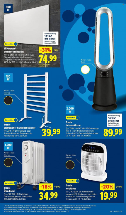 Bitte beachten Sie, dass dieser Text automatisch generiert wird und möglicherweise Fehler enthält= en | | | | | Lidl Ratenzahlung 16.15 € | | pro Monat Laufzeit 6 Monate® | Gesamtpreis 96.92 Nur ontine @) S Silvercrest® + | I LIE EP = © | 3 Heizstufen. Mit Thermostat und LE Display zur Anzeige KL Temperatur. il Temperatur einstellbar zwischen 12 und 99 Weitere Farbe: Il WeiB. u | 38 °C. Ca. B95xH 60 az cm. Je Stück CLS 6 zuschlag 19.95 & © 0) 150 5 ® Weitere Farbe: Schwarz 2.000 W Lidl Ratenzahlung Œ 16.51€ LGG pro Monat Laufzeit 6 Monate? Tro: Heizventilator Gesamtpreis 99.04 Elektrischer Handtuchwärmer Typ „TRHV 2000 A1“. Mit LED-Stimmungs- Typ „SHH 150 D1“ Als Wand- oder licht in 5 verschiedenen Farben und Standgerät nutzbar. Temperatur der Farbwechsel. 20 Geschwindigkeitsstufen. 39.39 89,99 Heizstäbe ca. 50 °C. Je Stück Ca. 103 x 28 x 28,5 cm. Je Stück > 1.500 w Er = eo Weitere Farbe: Schwarz Weitere Farbe: ll Schwarz 111] II UI ll HN I] Il Ha N il 1 1j I : Œ Tro: Tronic > LE fter „20% + Ölradiator Typ,THLF 2000 E4*. Mit Fernbedie- Typ „TOR 1500 HI“. Stufenloser nung und LED-Display. Auch als Lüfter Thermostatregler und 3 Heizstufen verwendbar. Individuell regulierbare EL (600/900/1.500 W).Je Stück 34.99 Temperatur (15-35 °C). Je Stück * Vorbehaltlich Bonitätsprüfung. Laufzeiten von 3,6,9,12,18 oder 24 Monaten. Ab 60 € und bis zu 5000 € Bestellwert mit monatlicher Mindestrate von 10€. Es gilt ein effektiver Jahreszins von 10.99% p.a, entspricht einem festen Sollzinssatz von 10,48% p.a. Repräsentatives Beispiel gem. 817 (4) PAngV: Nettodarlehensbetrag 200 €, Gesamtbetrag 212.10 €, 12 monatliche Raten à 17.68 €, eff. Jahreszins 10.99% p.a. DerTeilzahlungsverkäufer ist Lidl Digital Deutschland GmbH & Co. KG, Bonfelder Straße 2, 74206 Bad Wimpfen. "Weitere Infos auf S. 17. DHZ- 45/2025 - DE