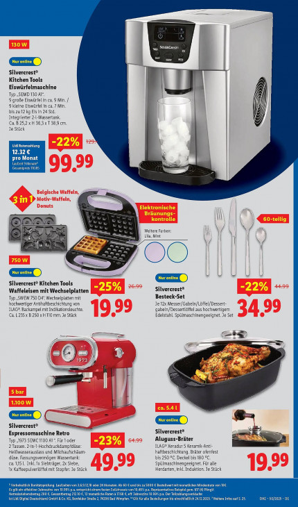 Bitte beachten Sie, dass dieser Text automatisch generiert wird und möglicherweise Fehler enthält= Ô rx SLVERCRESTS CL Œ Silvercrest® Kitchen Tools Eiswürfelmaschine Typ „SEMD 130 Al“, 9 groBe Eiswürfel in ca. 9 Min. / | 9 kleine Eiswürfel in ca. 7 Min bis zu 12 kg Eis in 24 Std. Integrierter 2-l-Wassertank. ; Ca. B25,2x H 36,3xT 38,9 cm. Je Stück ia Lidl Ratenzahlung 12.32 € pro Monat Laufzeit 9 Monate® CON 4e ( PR) Fess LL A \ 4 ( 9 al En E E Weitere Farben: @) | Lila, Mint MS + | A a; mn VS = OO am ># Silvercrest® Kitchen Tools Silvercrest® Waffeleisen mit Wechselplatten Besteck-Set Typ „SWEW 750 D4“ Wechselplatten mit hochwertiger Antihaftbeschichtung von Je 12x Messer/Gabeln/Lôffel/Dessert- ILAG®. Backampel mit Indikationsleuchte. gabeln/Dessertlöffel aus hochwertigem Ca. L 235 x B 250 x H 110 mm. Je Stück Edelstahl. Spülmaschinengeeignet. Je Set m CR en = N lo 1) ER ef: (SN x = u F Ea Silvercrest® == > rn Silvercrest® Espressomaschine Retro Aluguss-Bräter Typ „1973 SEMC 1100 A1“. Für 1 oder 2 Tassen. 2-in-1-Hochdruckdampfdüse: ILAG® Xeradur 5 Keramik-Anti- Heißwasserauslass und Milchaufschäum- haftbeschichtung. Bräter ofenfest bis 250 °C. Deckel bis 180 °C. düse. Fassungsvermögen Wassertank: ca.1,15 1. Inkl. 1x Siebträger, 2x Siebe, Spülmaschinengeeignet. Für alle 1x Kaffeepulverlöffel mit Stopfer. Je Stück Herdarten, inkl. Induktion. Je Stück ® Vorbehaltlich Bonitätsprüfung. Laufzeiten von 3,6,9,12,18 oder 24 Monaten. Ab 60 € und bis zu 5000 € Bestellwert mitmonatlicher Mindestrate von 10€. Esgiltein effektiver Jahreszins von 10.99% p.a, entspricht einem festen Sollzinssatz von 10,48: ‚a. Repräsentatives Beispiel gem. 517 (4) PAngV: Nettodarlehensbetrag 200 €, Gesamtbetrag 21210 €, 12 monatliche Raten à 17,68 €, eff, Jahreszins 10,99% p.a. Der Teilzahlungsverkäufer ist Lidl Digital Deutschland GmbH &.Co. KG, Bonfelder Straße 2, 74206 Bad Wimpfen. “ilt füralle Bestellungen bis einschließlich 24.12.2025. "Weitere Infos auf S. 25. AE eld