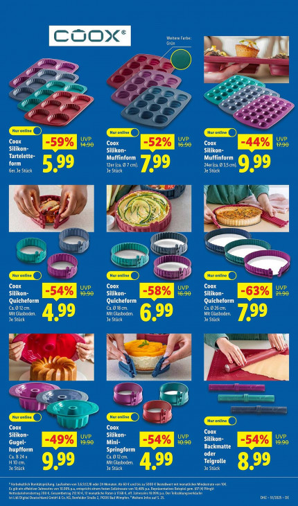 Bitte beachten Sie, dass dieser Text automatisch generiert wird und möglicherweise Fehler enthältWeitere Farbe: Grün Fa @\ MTS AN 20 (A 2 3 er u EP > pe DA eG A € A (A ZT à > =) EN U É N (A FA 2 à \ 4 UVP UVP UVP Coox Coox Coox 44 Silikon- Silikon- SIL Tartelette- Muffinform LOTO LOU 12er (ca. @ 7 cm). ‘24er (ca. 9 3,5 cm). CEST 599 ENT rn BRS 999 eg zu A Er À ii A el AR NS EN TS N 223 \ v C N Au > A a 1 GG A aa peut (Im u IL rv mr, Coox Coox Coox UVP UVP ECT LAC A Silikon- -58% LA A Silikon- UVP Quicheform Quicheform Quicheform Ca. 92cm. Ca.018cm. Ca.026 cm. Mit Glasboden. Mit Glasboden. LE Mit Glasboden. Je Stück 99 Je Stück Je Stück 79 [2 N \ D (14 N er ; >. EN + CA EE 7 | — Ù I Coox Coox Coox Silikon- UVP Silikon- UVP UVP 49% 19-90) Mini- 40-90 Silikon- EAA Gugel- Backmatte hupfform Springform Ca.B24x Ca.012cm. oder H10 cm. Mit Glasboden. Teigrolle LEO 0 99 LES 99 LESC 899 ® Vorbehaltlich Bonitätsprüfung. Laufzeiten von 3,6,9,12,18 oder 24 Monaten. Ab 60 € und bis zu 5000 € Bestellwert mit monatlicher Mindestrate von 10€. Es gilt ein effektiver Jahreszins von 10.99% p.a, ent. einem festen Sollzinssatz von 10,48% p.a. Repräsentatives Beispiel gem. 817 (4) PAngV: Nettodarlehensbetrag 200 €, Gesamtbetrag 212.10 €, 12 monatliche Raten 4117.68 €, eff. Jahreszins 10,99% p.a. Der Teilzahlungsverkäufer. ist Lidl Digital Deutschland GmbH & Co. KG, Bonfelder Straße 2, 74206 Bad Wimpfen.” Weitere Infos auf S. 25. DHZ - 51/2025 — DE